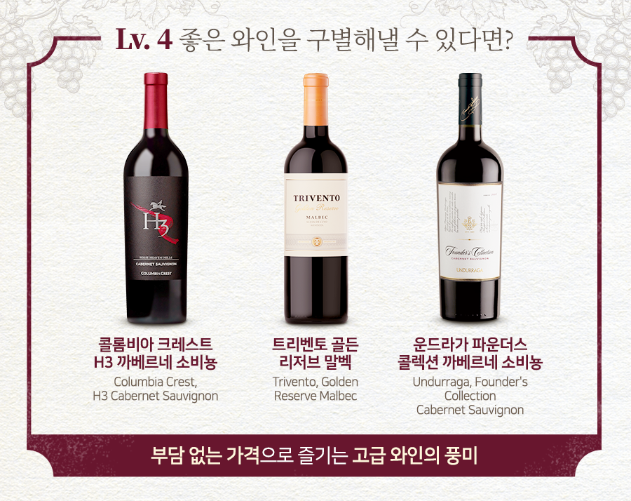 Lv. 4에서 소개해 드린 와인은 미국, 아르헨티나, 칠레 와인입니다. ‘이게 바로 고급 와인이구나!’라는 느낌을 받을 수 있도록 구성해 보았어요. 가격대는 3만 원대로 행사를 잘 활용해 보신다면, 크게 부담 없는 가격으로 고급 와인의 풍미를 경험하실 수 있습니다.