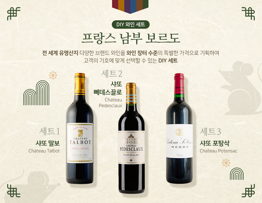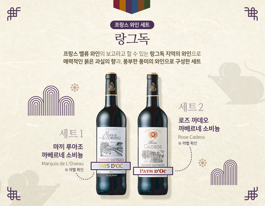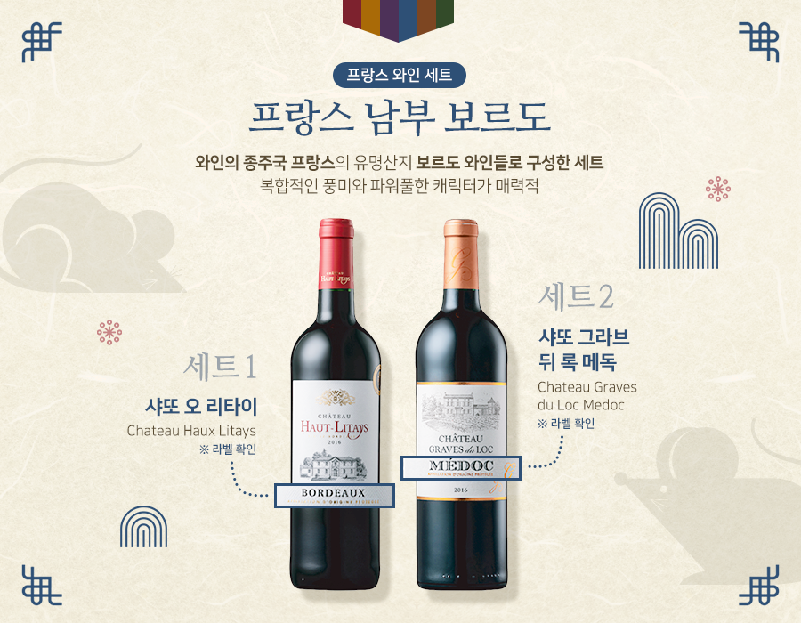 두 번째 프랑스 와인 세트를 한번 볼게요. 생전 처음 보는 라벨에 읽기 어려운 프랑스 세트를 발견하셨다면, 이 와인 세트는 명절에만 선물용으로 활용하기 위해 수입된 상품입니다. 주는 사람은 가격을 보고 사지만 받는 사람은 가격을 쉽게 알 수 없어요. 물론 이 글을 읽으신 분들이나, 와인 애호가분들은 추측 가능하겠죠. 신속하게 라벨을 훑어볼게요. pays d’oc, bordeaux, medoc, bordeaux superieur, cru bourgeois 이런 문구, 라벨에서 찾으셨나요? 아마 써드린 순서대로 가격대가 올라가는 걸 느끼실 수 있을 거예요. 프랑스에는 여러분들이 한 번쯤 들어본 그란크뤼 포도팥 외에 수많은 와이너리들이 존재하고 있어요. 국내에 소개되지 않은 수많은 와이너리 와인 중 일부가 명절 기간에 한시적으로 수입된답니다. 프랑스가 와인 명산지 인 건 다들 아실 테니 뭔가 새로운 스타일의 프랑스 와인을 경험해 보고 싶다면 원하는 가격대의 등급으로 선택해 보세요.