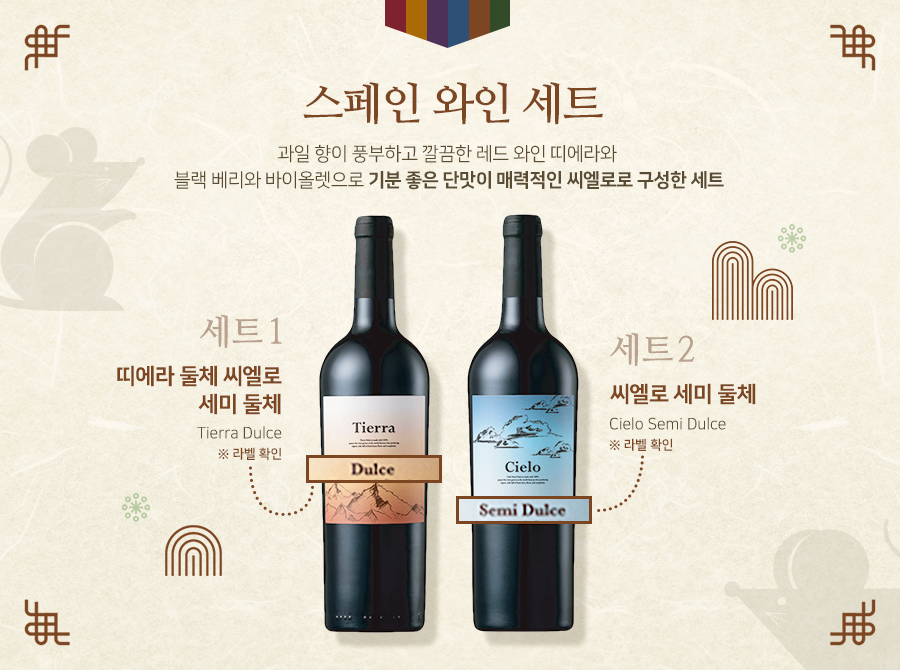 세 번째는 스페인 와인이에요. 전세계에서 와인 생산량 TOP 3 국가 중 하나랍니다. 스페인 와인 세트의 특징은 저렴해요. 저렴한 와인 세트가 많아서 훌륭한 스페인 와인이 저평가 되기도 한답니다. 보통 2만원대 선물 세트에서 스페인 와인을 많이 볼 수 있어요. 이 선물 세트의 특징은 와인 입문하시는 분들도 쉽게 드실 수 있도록 약간 달달 한 게 특징이에요. 라벨에 Dulce, Semi dulce라고 써 있는지 확인해 보세요. 이렇게 써 있다면 달아요. 물론 달지 않은 와인도 있으니 라벨을 잘 살펴 보세요.