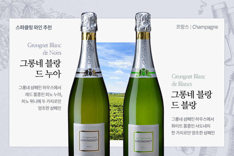 샴페인은 보통 피노누아, 피노뮈니에, 샤도네이 3가지 품종을 블랜딩해서 생산합니다. 물론 비율이나 조합은 샴페인마다 다르죠. 레드 포도 품종(피노누아, 피노뮈니에 등)만을 블랜딩한 샴페인은 블랑 드 누아(Blanc de Noirs), 화이트 포도 품종(샤도네이 등)만을 블랜딩한 샴페인은 블랑 드 블랑(Blanc de Blancs) 이라고 부릅니다. 프랑스어로 블랑(Blanc)은 흰색이란 뜻이고 누아(Noir)는 검정색을 뜻합니다. 샴페인은 화이트 샴페인이니, 블랜딩한 포도 품종의 색상에 따라 블랑 드 누아, 블랑 드 블랑으로 칭하는 거겠죠? 이 정도만 알아도 샴페인 좀 안다는 소리 충분히 들을 수 있답니다.