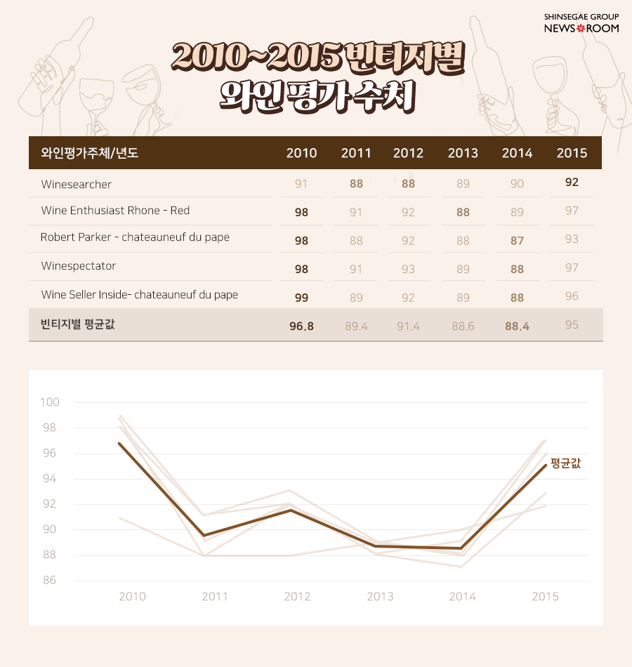 시음하기 전에는 제가 각종 자료를 분석하여 오늘 시음할 와인의 각 연도별 평균 점수를 도출해 두었습니다. 세계적인 와인 전문지 및 와인 검색 사이트 등 총 5곳이 평가한 점수로 평균을 내보았습니다. 종합적으로 2010년과 2015년이 좋은 점수를 받았네요.