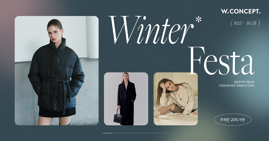 W컨셉은 ‘윈터페스타’ 기획전 오픈을 기념해 ‘어패럴’, ‘잡화’, ‘뷰티&라이프’ 상품별로 사용할 수 있는 무제한 20% 할인쿠폰도 선착순으로 발급한다.
